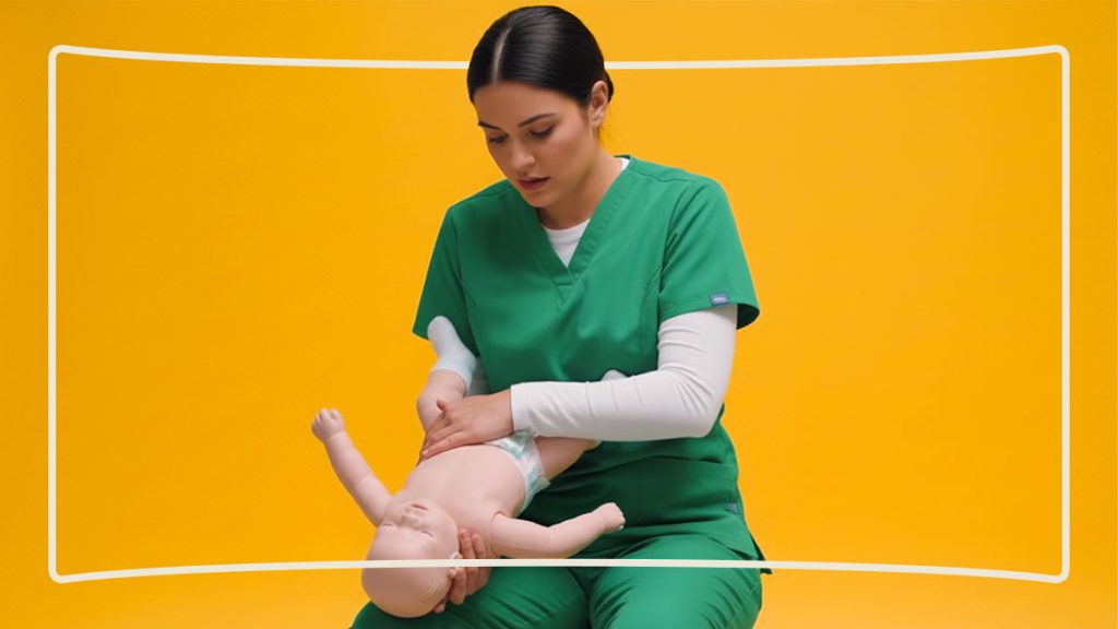 Vire o bebê de barriga para cima e realize cinco compressões no peito, no centro do tórax, com a base da palma da mão.