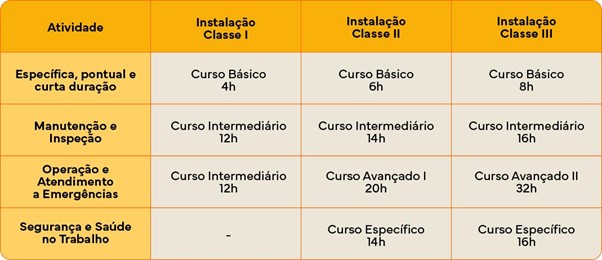 Com base no Anexo I da NR-20, os cursos são definidos conforme a atividade desenvolvida e a classe da instalação.